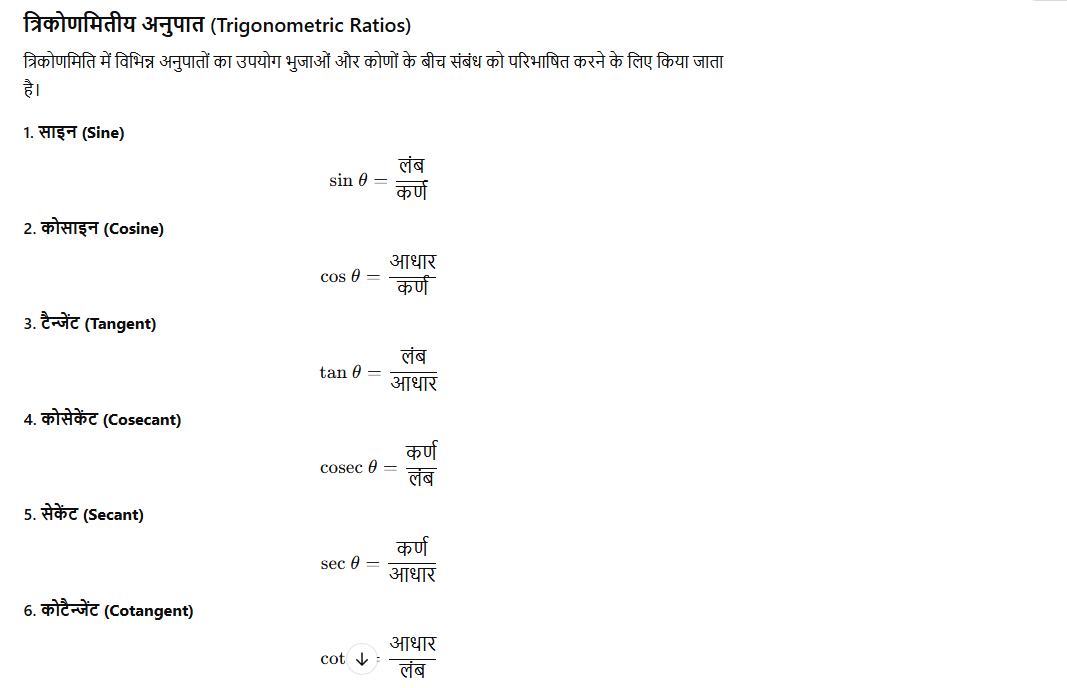 त्रिकोणमिति का परिचय:  गणित की एक महत्वपूर्ण शाखा है, जिसका उपयोग ज्यामिति और अन्य क्षेत्रों में किया जाता है। यह त्रिभुज के कोणों और उनके संबंधित भुजाओं के बीच संबंधों का अध्ययन करती है। “त्रिकोणमिति” शब्द संस्कृत के “त्रि” (तीन), “कोण” (एंगल), और “मिति” (मापन) से बना है, जिसका शाब्दिक अर्थ है “त्रिकोण के कोणों का मापन”। इस विषय का उपयोग विभिन्न वास्तविक जीवन की समस्याओं को हल करने में किया जाता है, जैसे वास्तुकला, भौतिकी, इंजीनियरिंग, और खगोल विज्ञान में।
