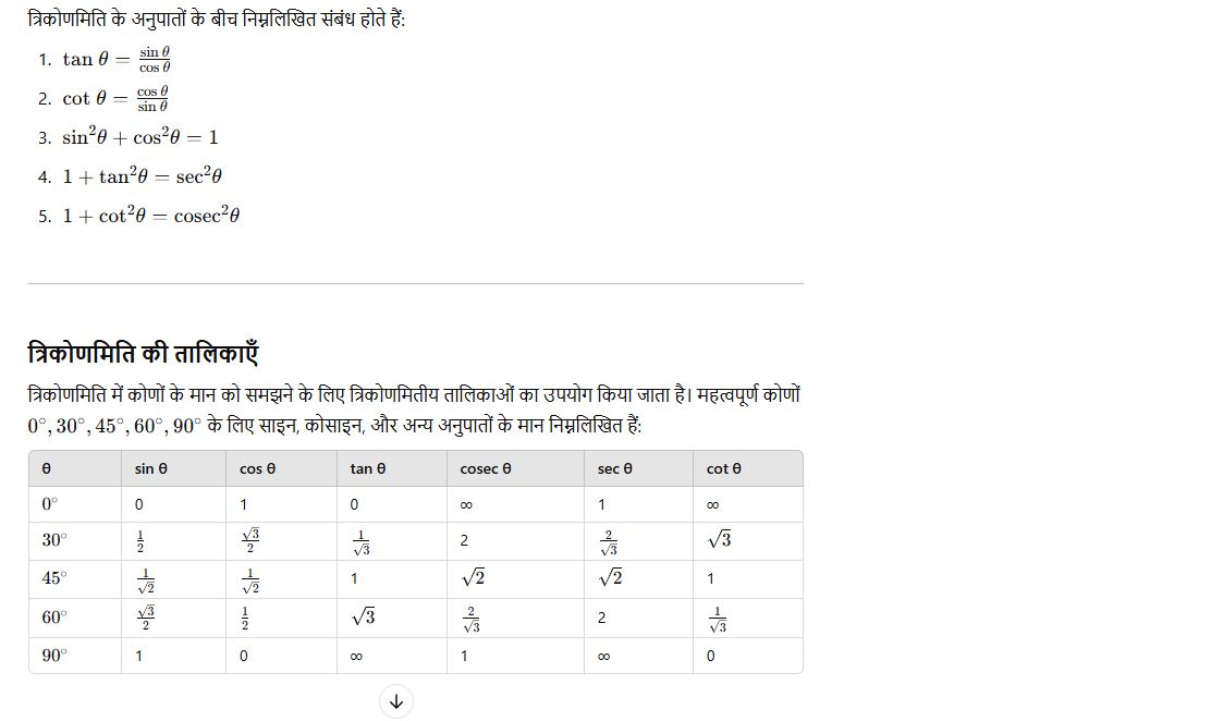 त्रिकोणमिति एक ऐसा उपकरण है जो न केवल गणित बल्कि विज्ञान, इंजीनियरिंग, और जीवन के कई क्षेत्रों में भी अत्यंत उपयोगी है। इसके अनुपातों, सूत्रों, और संबंधों को समझकर हम जटिल समस्याओं को हल कर सकते हैं। त्रिकोणमिति का अभ्यास हमें न केवल परीक्षाओं में सफल बनाता है, बल्कि हमें इसे वास्तविक जीवन में भी उपयोग करने में सक्षम बनाता है।