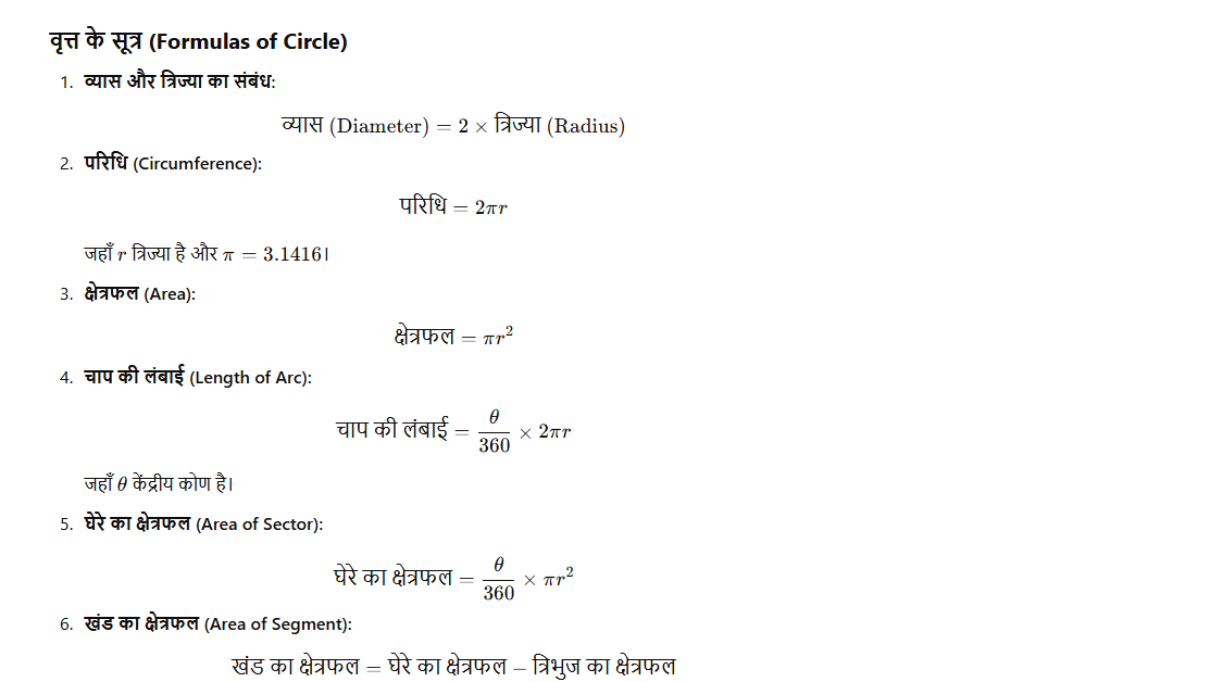 4. परिधि (Circumference): वृत्त की बाहरी सीमा की लंबाई।